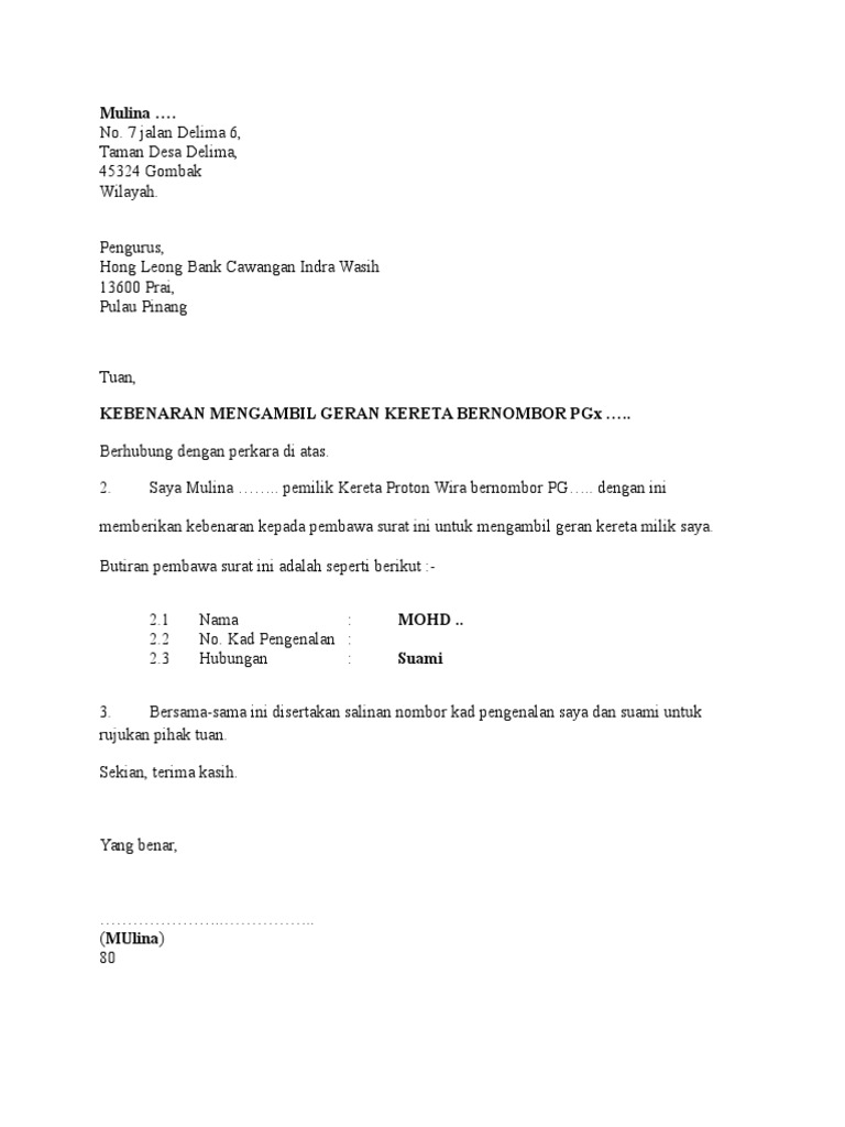 Contoh Surat Wakil Ambil Geran Kereta Di Bank Surat Rasmi Wakil Ambil Sijil Surat Rasmi C Contoh Surat Wakil Ambil Geran Kereta